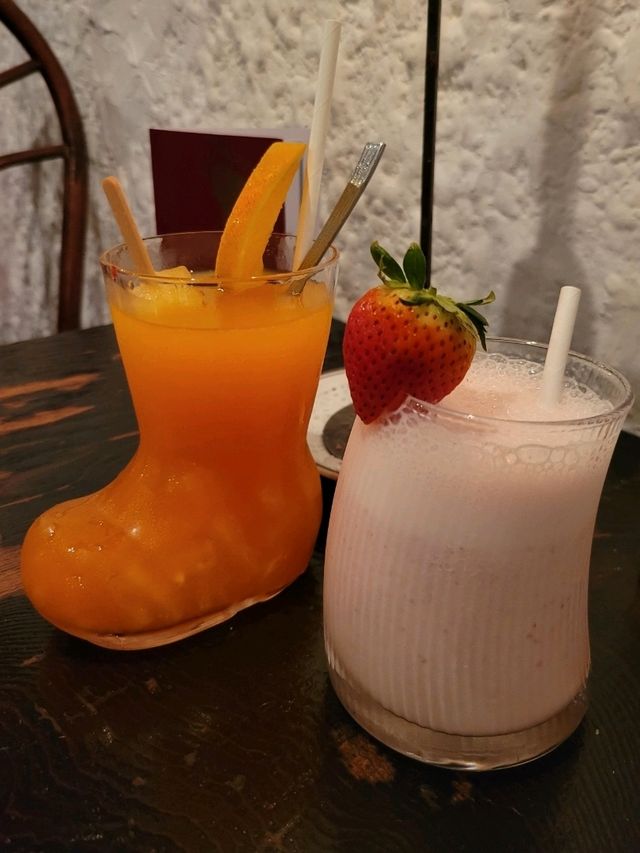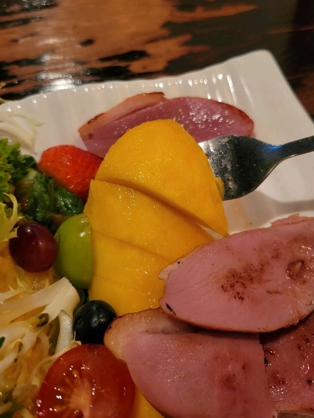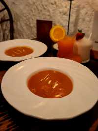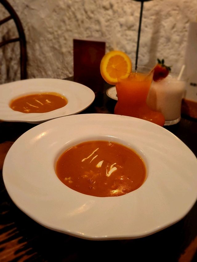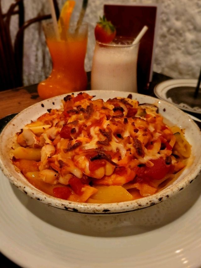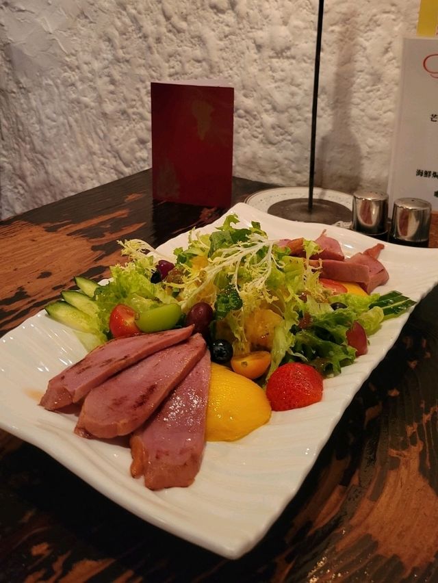 Tivoli is a traditional Italian restaurant with a striking red brick wall at the entrance. Inside, the decor is elegant, featuring soft lighting and vintage furnishings that create a nostalgic atmosphere🧡. We ordered a two-person set menu, which was very generous. Starting with the appetizer, Mango Smoked Duck Breast Salad 🥭🥗. The mango was sweet, and the smoked duck breast was tender and delicious. The potato salad was served in a large portion, accompanied by plenty of fresh salad greens❤️. The lobster was rich in flavor, with a strong lobster bisque taste🦞. For the main course, the Mustard Beef Tenderloin was amazing🐄. It was perfectly seared, full of beefy flavor, and juicy! The other main dish, Seafood with Eggplant Penne, was quite unique. It was baked to perfection and included shrimp, squid, and fish, making it a very hearty dish. We also ordered two signature drinks, Fruit Paradise and Pinklady, to enjoy with our candlelit dinner, which added a romantic touch~ 📍Tivoli Italian Restaurant G/F, 130 Austin Road