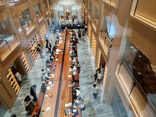 #September2025 Entering Xujiahui Bookstore, you're greeted by a refreshingly expansive atrium spanning three floors, complete with a 30-meter-long reading table. Wood tones and vaulted ceilings create a warm and majestic atmosphere, inviting relaxation and focus. Sunlight streams in through large windows, illuminating the harmonious blend of books and greenery, creating a delightful atmosphere. The cleverly designed exhibition spaces allow readers to experience culture and art while reading. This is more than just a library; it's a tranquil corner of the city where one can experience the beauty of life.