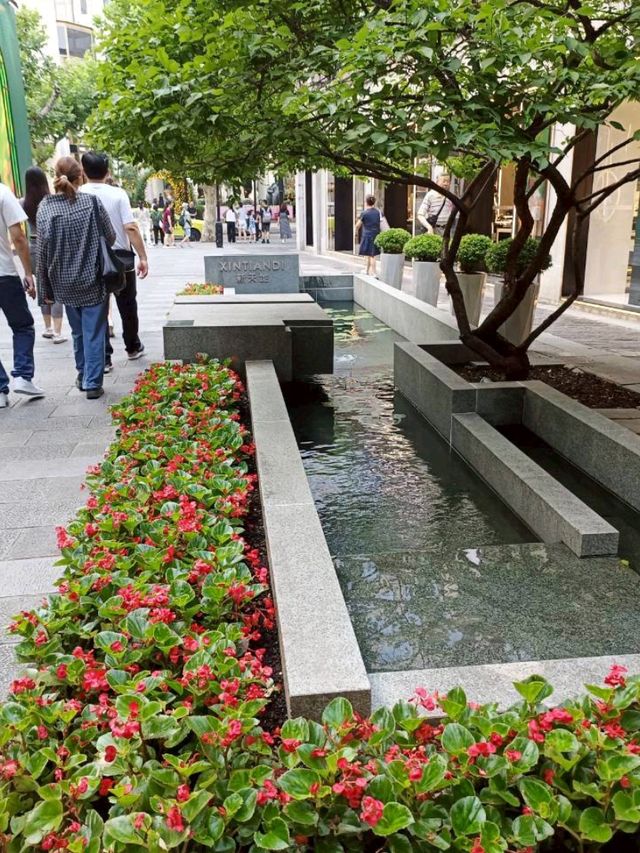 #September2025 Shanghai Xintiandi blends historic architecture with modern commercial functions, demonstrating a successful example of urban renewal and cultural preservation. Public spaces feature narrow water features, flanked by greenery and red flowers, creating an open and comfortable resting environment. Spacious sidewalks flow through the space, complementing the high-end retail window displays and creating a rich urban atmosphere. Characterized by its Shikumen architecture, Xintiandi combines landscape design with commercial vitality, becoming a key symbol of Shanghai's urban image.