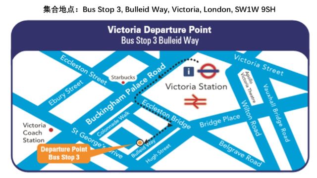 Lokasi kumpul: Halte bus No. 1 Bulleid Way, alamat: 123-151 Buckingham Palace Rd, Victoria, London SW1W 9SR