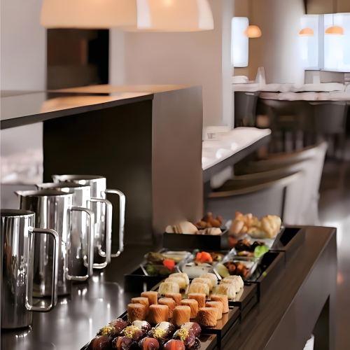 ▲ buffet yang berlimpah menyajikan bahan-bahan segar dan paling menggoda. Dari daging panggang segar hingga hidangan penutup yang semarak, warna-warna cerah dan aroma harum memenuhi ruangan, menanti pilihan para tamu.