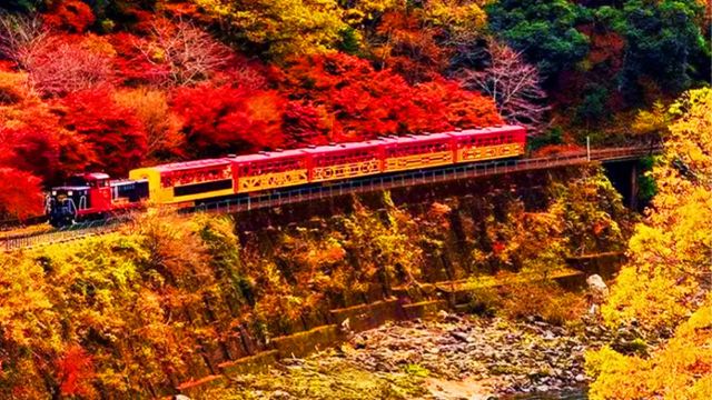 Jelajahi jembatan ikonik "Togetsukyo", berjalan melewati jalan setapak bambu yang tenang, dan nikmati keunikan seni "Hutan Kimono".